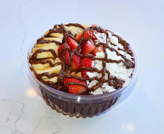Acai topped with granola, banana, strawberry, blueberries and a drizzle of honey.